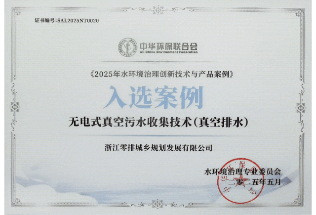 会议期间,中华环保联合会与政府部门、科研院校、创新企业联合发布《水环境治理创新技术与产品案例》,浙江零排城乡规划发展有限公司的“无电式真空污水收集技术(真空排水)”成功入选。